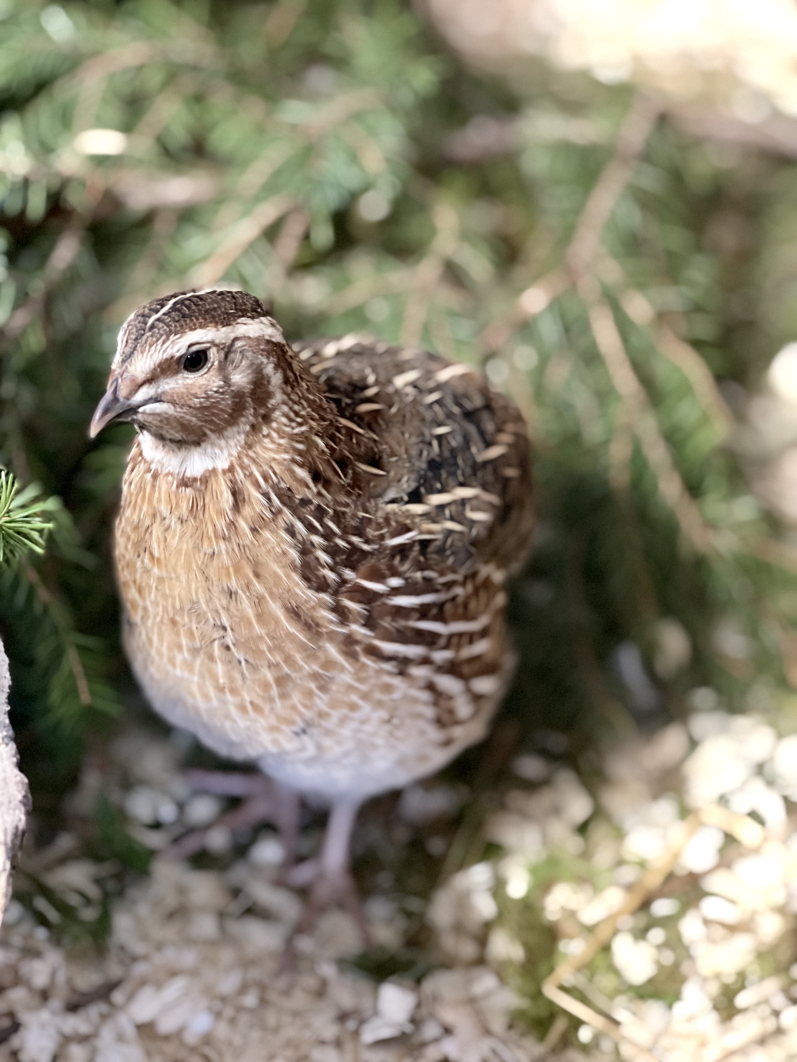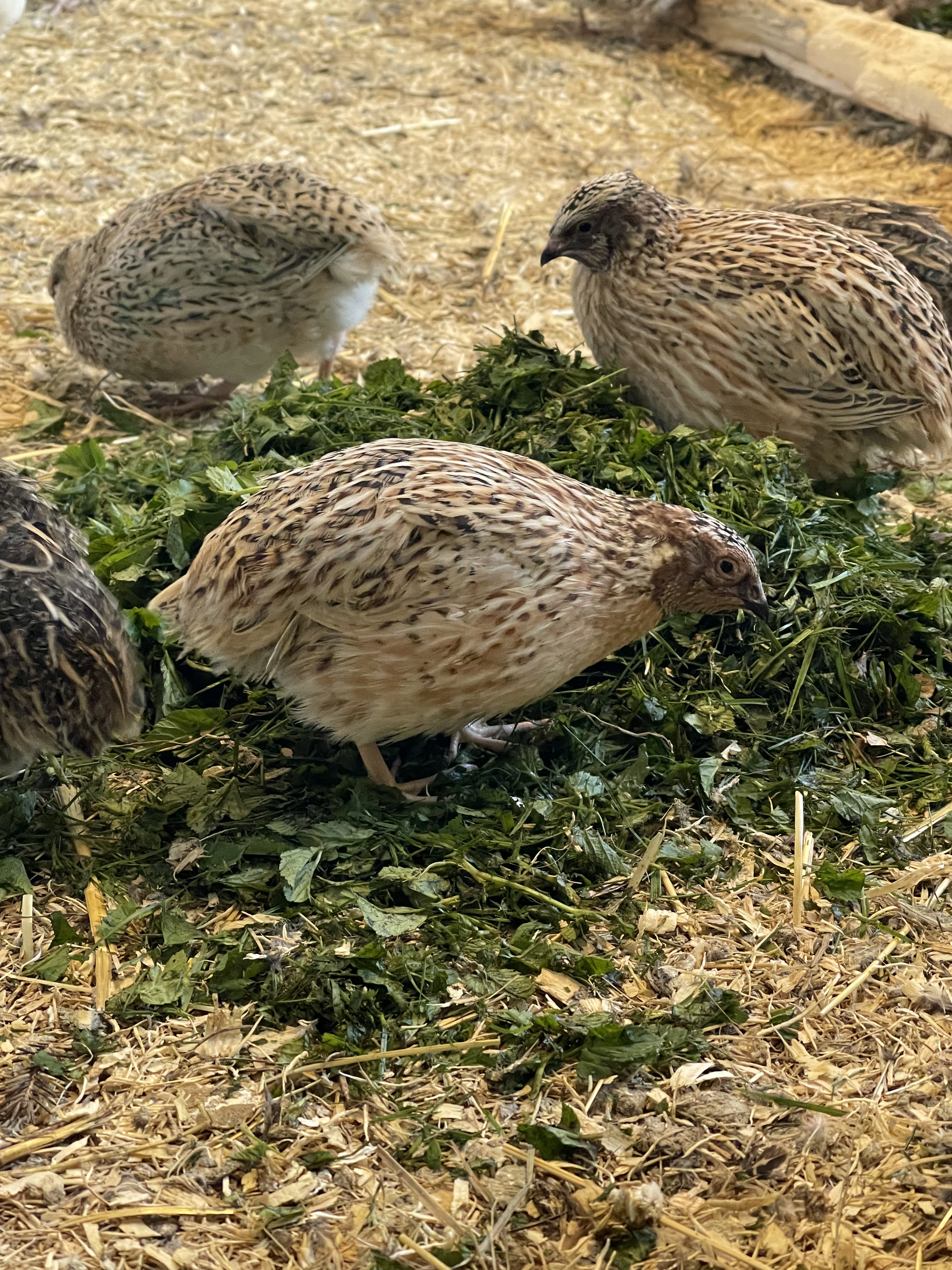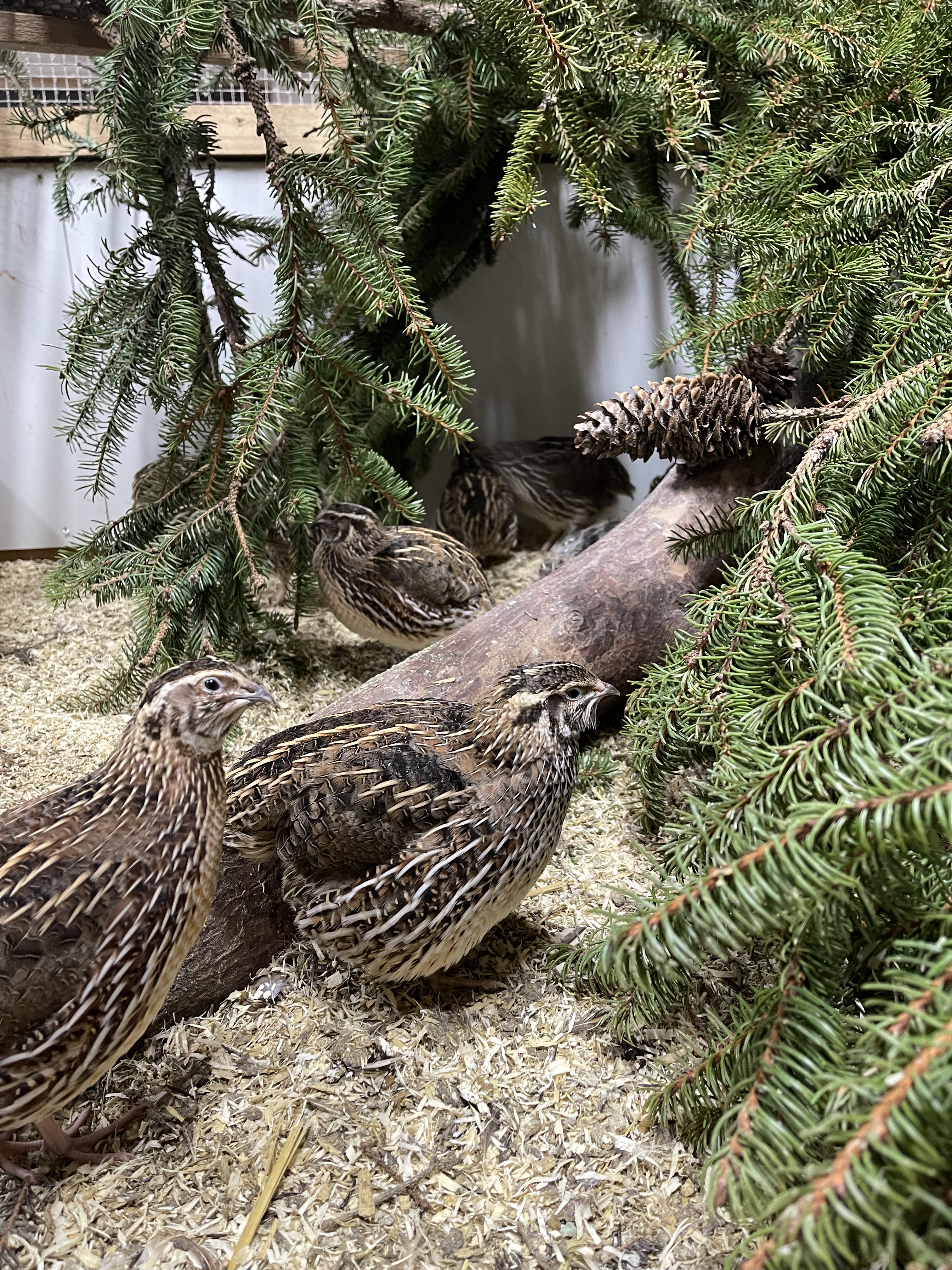 Vaktlene våre rusler rundt i store bur/volier med strø og varierende mengde mose, granbar og skogsmaterialer etter sesong. Vi har ikke våre vaktler utendørs, så vi prøver å trekke naturen inn i fjøset. Det gir masse gjemmesteder og mindre aggresjon. Vaktler kan være ganske hissige på hverandre, så det å kunne stikke seg vekk under en grankvist for å få fred er viktig for trivselen.